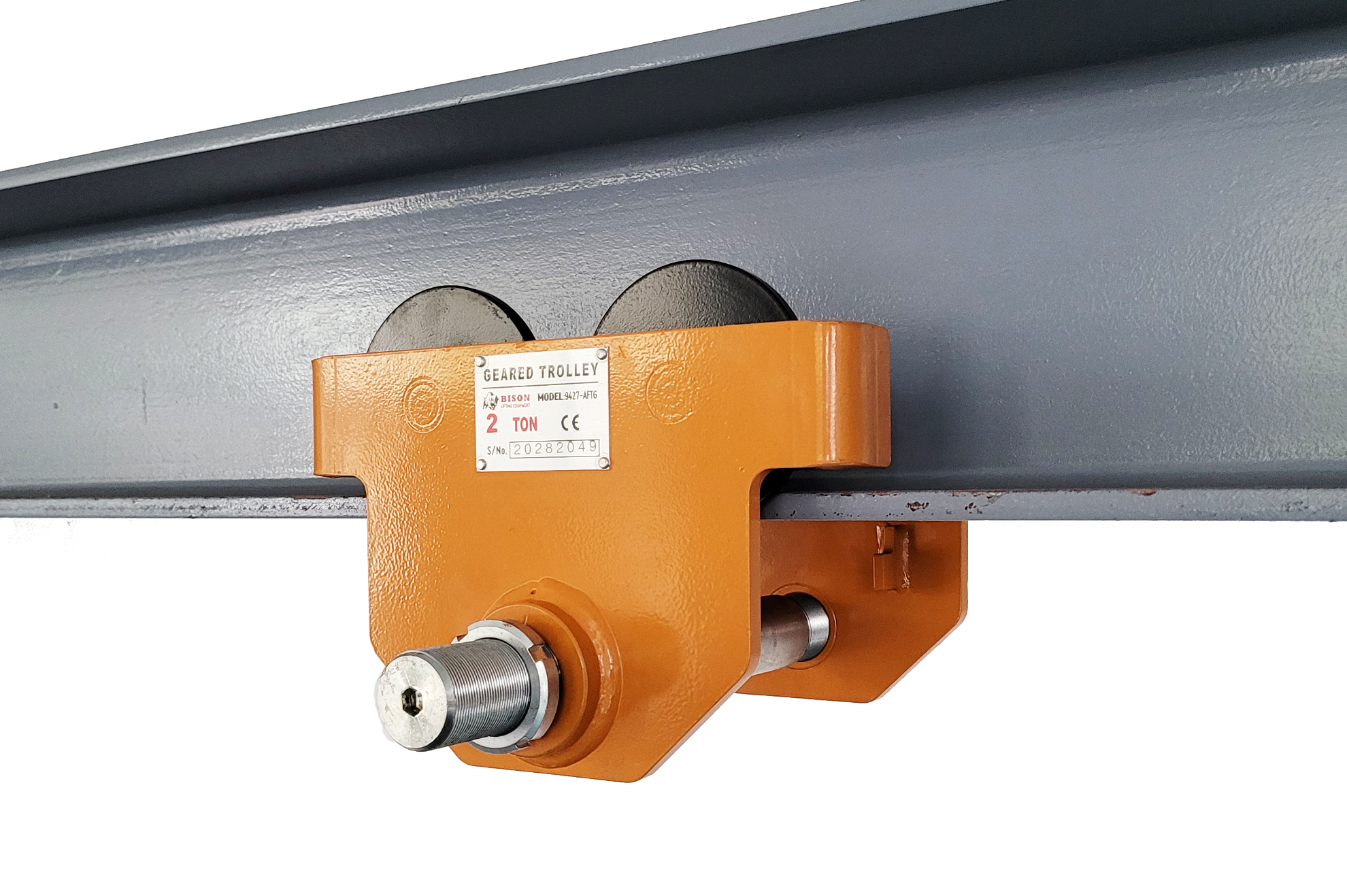 Threaded shaft with Allen bit setting. Makes opening and closing the trolley to fit a beam ultra quick and convenient. Using a drill fitted with an Allen bit, simply work the trolley open and closed. Removes the need for collars/ spacers. This design provides best in class headroom and accommodates wider beam flanges.