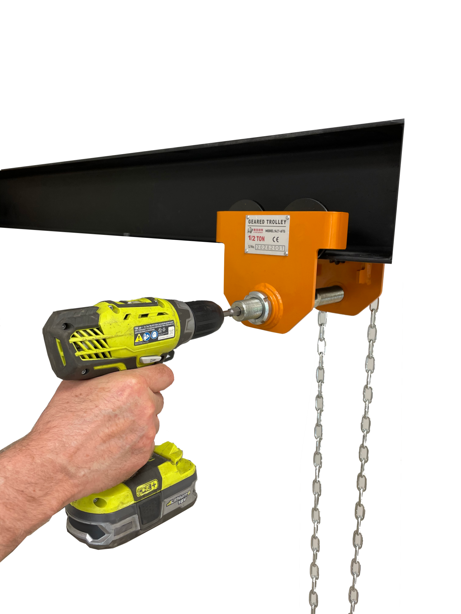 Threaded shaft with Allen bit setting. Makes opening and closing the trolley to fit a beam ultra quick and convenient. Using a drill fitted with an Allen bit, simply work the trolley open and closed. Removes the need for collars/ spacers. This design provides best in class headroom and accommodates wider beam flanges.