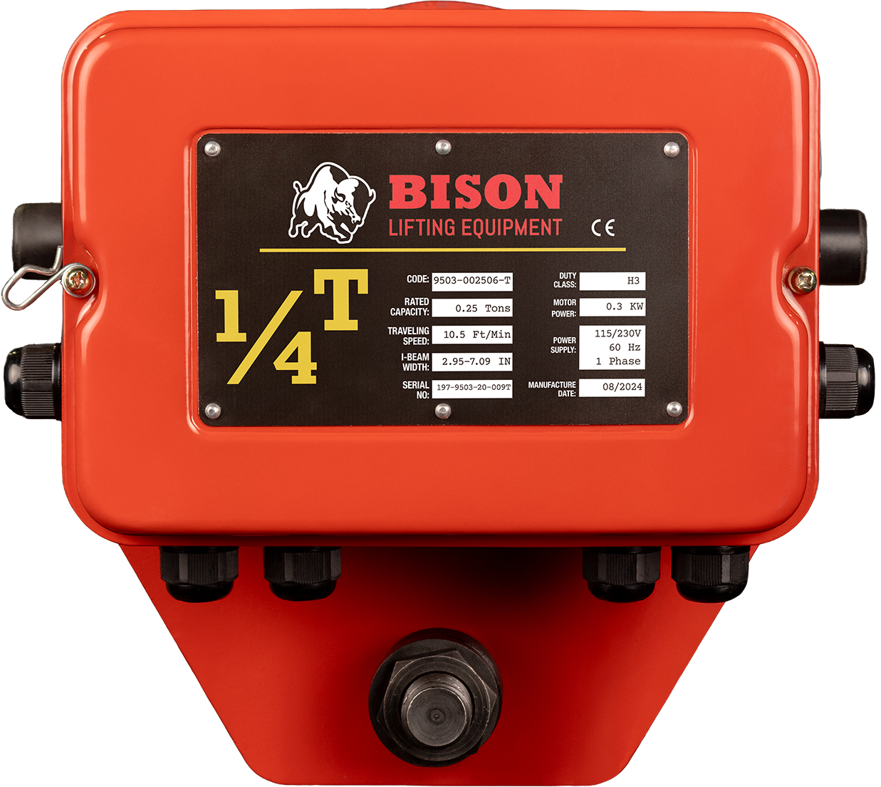 The Bison sinlge phase motorized trolleys are universal to all hoists. The trolley can be controlled indepently through its own pendant crontroller. Only hoists with 24V control can be wired into the motorized trolley to be operated all through one pendant.